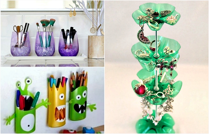 Пластиковые бутылки – отличный материал для создания органайзеров и контейнеров для хранения различных мелочей. Просто обрежьте верхнюю часть бутылки, обработайте края и украсьте по своему вкусу. Такие органайзеры можно использовать для хранения ручек, карандашей, кистей, косметики, ниток, пуговиц и многого другого.