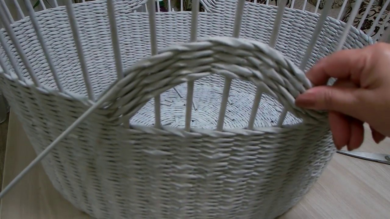 Для удобства использования, к корзине можно приделать ручки. Мы предлагаем два варианта: плетеные ручки из газетных трубочек или ручки из проволоки, обмотанные газетными трубочками.