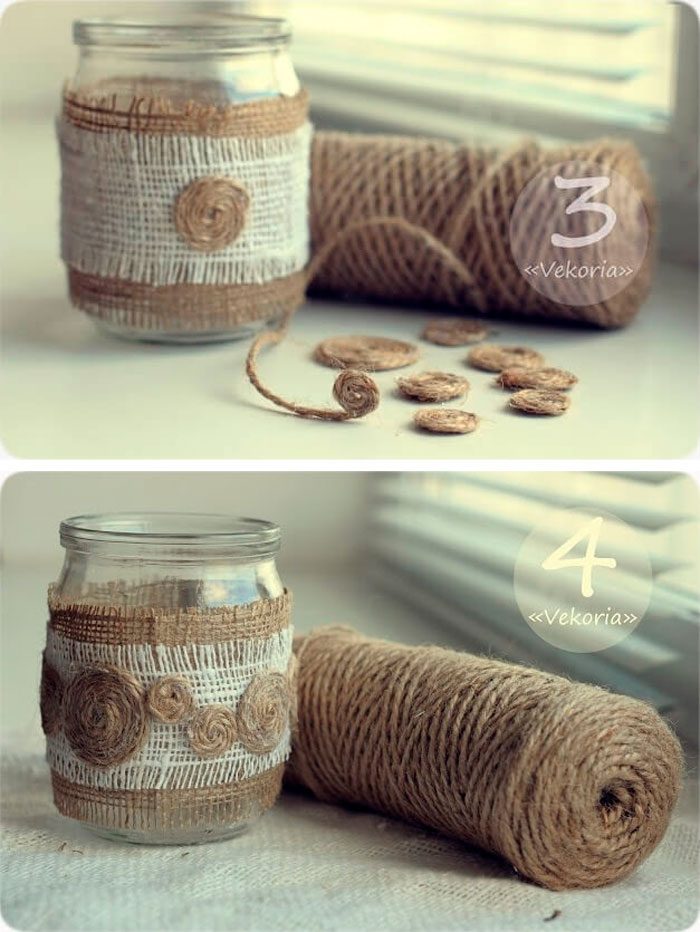 После того, как мы обмотали банку веревкой, можно приступать к декорированию. Здесь открывается огромный простор для творчества. Мы можем использовать: