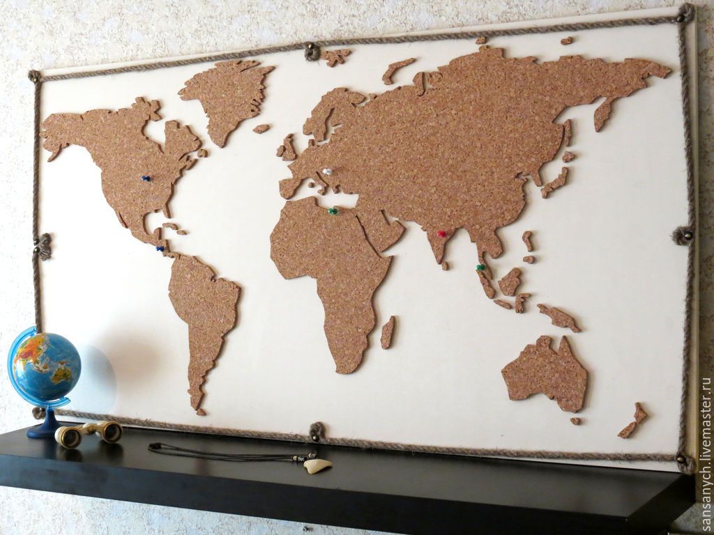 - Инструменты: Нож, пила (если нужно резать пробки), карандаш, линейка, наждачная бумага (если нужно шлифовать основу), трафарет карты мира (можно распечатать из интернета).